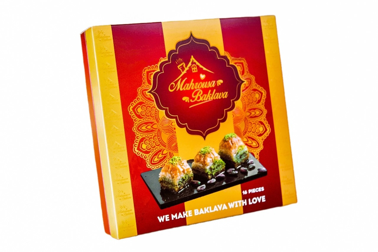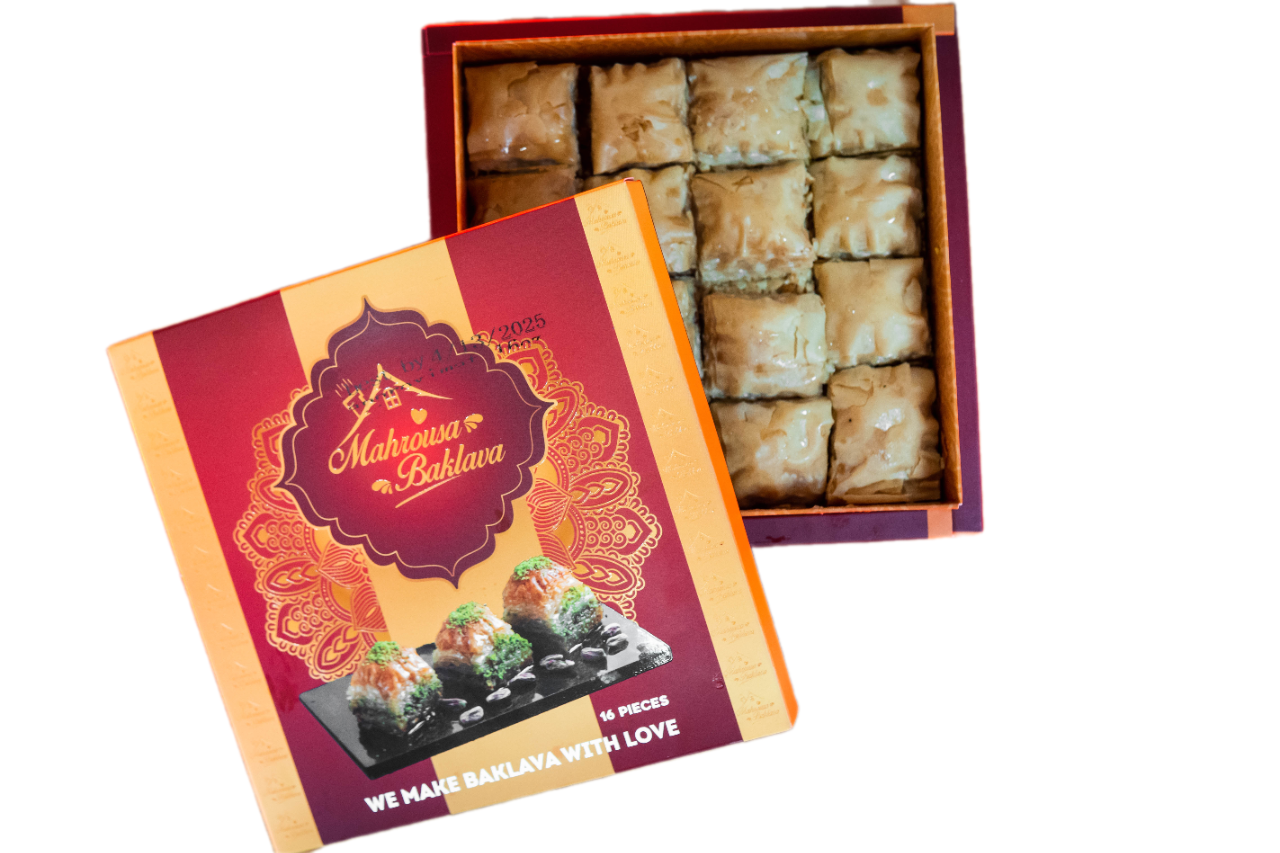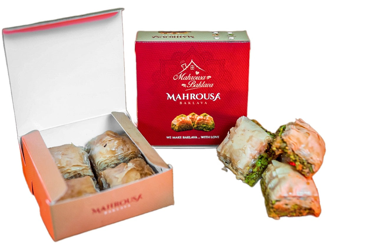 Mahrousa Baklava is made with great care from multiple layers of thin, crunchy phyllo dough, generously stuffed with a mixture of the finest selected nuts such as pistachios, cashews, walnuts.. etc.